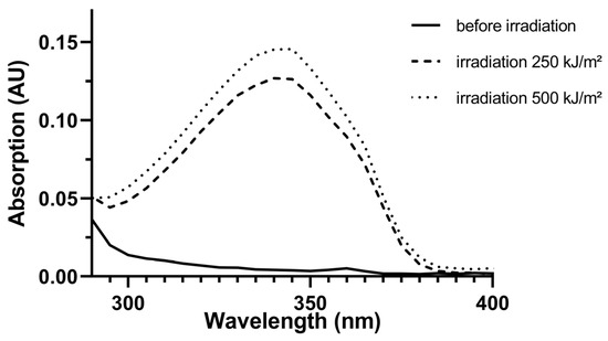 Before the irradiation, MeO-MBM did not absorb UV light above an intensity of 0.05 AU (Figure 2, solid line) in the wavelength region between 310 and 370 nm. After the substance was irradiated, both tested dosages of the irradiations resulted in an absorption above 0.05 AU, reaching a maximum of 0.12 AU (Figure 2, dashed line) and 0.15 AU (Figure 2, dotted line) at 340 nm. The increase in UV absorption after irradiation can be directly attributed to the formation of avobenzone.