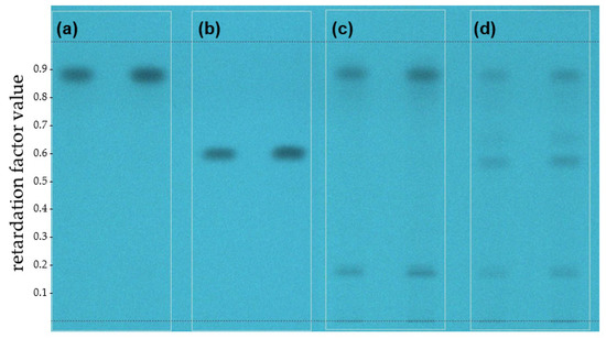 Before irradiation, the spot of avobenzone was visible at Rf = 0.88 (Figure 3a) and MeO-MBM at Rf = 0.59 (Figure 3b) on a high-performance thin-layer chromatography (HPTLC) chromatogram. The substance spots became more pronounced as the injection volume increased from 20 µL to 30 µL on each TLC plate. In the lanes containing irradiated avobenzone, a new spot at Rf = 0.17 (Figure 3c) was observed and could belong to the reported degradation product(s) 4-methoxybenzaldehyde or 1-(4-tert-butylphenyl) ethenone due to irradiation [16]. After the irradiation of MeO-MBM, the formation of a spot at Rf = 0.88 (Figure 3d) was visible and corresponded to avobenzone, as well as the degradation product(s) of avobenzone at Rf = 0.17. The formation of another unknown substance was detected at Rf = 0.66. Considering the structural similarity of MeO-MBM with dibenzoylmethanes, they could belong to the group of arylglyoxals or benziles as reported for dibenzoylmethanes, but this would require further investigation [22].