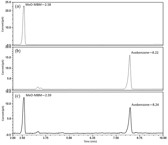 Before irradiation, the chromatogram obtained by ultra-high-performance liquid chromatography (UHPLC) coupled with a charged aerosol detector (CAD) showed a single peak at tR = 2.58 for MeO-MBM, and no avobenzone was detected at Rt = 8.22 (Figure 4a). A sample of pure avobenzone showed a retention time of 8.22 (Figure 4b). After irradiation, the sample showed the formation of avobenzone (Figure 4c). In the irradiated sample, the concentration of MeO-MBM was 48.5 µg/mL and 46.2 µg/mL for avobenzone, resulting in a calculated conversion rate from MeO-MBM to avobenzone of 48.8%.