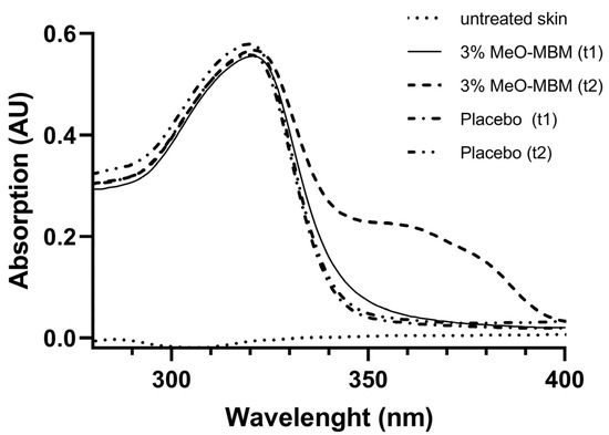 The tested formulation with and without MeO-MBM (placebo) was a formulation containing a mixture of UVB filters that provided SPF 10 in vivo. Untreated skin marginally absorbed UV light between 280 and 400 nm (Figure 5). The placebo showed an absorption between 280 and 320 nm and no absorption of UVA between 340 and 400 nm before irradiation (t1) and after irradiation (t2) (Figure 5). The formulation with MeO-MBM demonstrated no absorption prior to UV irradiation (t1), but a clear absorption peak was detectable above 0.05 AU between 340 and 390 nm after UV irradiation (t2). The data shown in Figure 5 indicates that the UVB absorption is a result of the used UVB filters in the formulation, as well as the photoconversion of a non-UV-absorbing material to a UV-absorbing material with known properties, like avobenzone on human skin in vivo.
