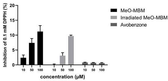 MeO-MBM antioxidative effect by the inhibition of DPPH radicals before and after irradiation and avobenzone in concentrations at 10, 50, and 100 µM. Data points represent the mean value ± standard deviations of three samples (n = 3).