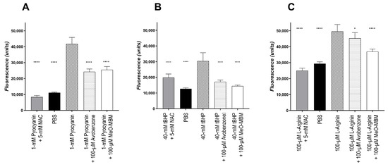 Cellular ROS/RNS scavenging capacity. The capability of avobenzone and MeO-MBM to scavenge intracellular ROS and RNS was assayed in HaCat. The cells were incubated with the test substances for 24 h; after which, stress was induced using (A) Pyocyanin as an inducer of ROS, superoxide radical (B) tBHP as an inducer for only ROS species, and (C) l-arginine as an inducer for RNS. As a negative control, N-acetyl-cystine was used. The significance was analyzed by one-way ANOVA with Dunnett’s multiple comparison test; *, p < 0.05 and ****, p < 0.001.