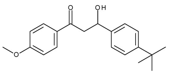 Chemical structure of 3-(4-tert-butylphenyl)-3-hydroxy-1-(4-methoxyphenyl) propan-1-one (MeO-MBM).