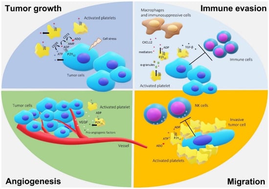 Cancer cells that more effectively activate platelets have been shown to have high aggressiveness rates. This is because platelets promote migration and invasion by shielding tumor cells from NK cells’ attack, enhancing adhesion and transmigration across the endothelium and promoting angiogenesis and proliferation by the release of ATP and ADP [89,90,95,105]. The nucleotides are mediators that are known to participate in tumor growth and inflammation [10,67]. ADP binding to P2Y12R plays a critical role in maintaining a very low cAMP level and sustained high activity of the PI3K/Akt cascade for glioma growth. P2Y12R activation inhibits the cAMP-induced differentiation of C6 glioma cells and converts the differentiation into an enhanced proliferation [106,107]. Elevated levels of AC activity and cAMP levels are prejudicial for tumors because they were related to the stabilization of the cell morphology and diminished growth rates in neoplastic cells, so the maintenance of a vicious cycle involving nucleotides in the TME is relevant for tumors [108].