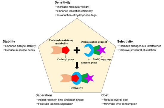 As described above, modification of carbonyl-containing metabolites by a chemical derivatization strategy can convert them into LC-separable and MS-detectable derivatives. As shown in Figure 1, an excellent chemical derivatization reagent should be able to (1) enhance the stability of analytes by modifying the unstable moiety of analytes and reduce its in-source decay during MS detection [44,45], (2) improve the detection selectivity through removing endogenous interference or aiding structural elucidation by characteristic fragmentation in collision-induced dissociation (CID) [46,47], (3) improve the chromatographic separation performance and peak shape of analytes by adjusting retention time [48,49] and facilitate isomers separation by chiral derivatization reagents [50,51,52,53], (4) enhance detection sensitivity by the introduction of hydrophobic tags or permanent charged moiety to enhance ionization efficiency and improve the fragmentation pathway of analyte in CID for tandem MS analysis [54], and (5) reduce overall cost and improve throughout [55].