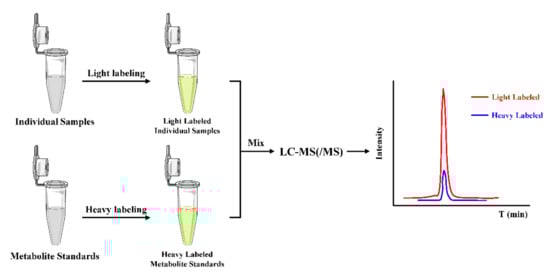 In the ICD strategy, as illustrated in Figure 5, the stable isotope-coded moiety of the derivatization reagent is used to label the standard metabolites of known amounts to form derivatives, which acts as ISs and can generate isotope ISs for all the target metabolites simultaneously in the derivatization step. Therefore, ICD could significantly improve the quantitative accuracy and precision by compensating for ESI matrix effects and instrument drift.