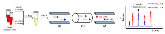 Stable isotope labeling double precursor ion scan MS analysis (IL-DPIS-MS) strategy is an alternative method for untargeted metabolic profiling without HRMS or prior knowledge of a metabolites list. It was firstly proposed by Feng’s group, in 2017, for profiling and relative quantitation of carbonyl compounds in human serum derivatized with HIQB/d7-HIQB [81]. As shown in Figure 6, two characteristic product ions of m/z 130.1 and 137.1 were obtained from HIQB/d7-HIQB labeled carbonyl compounds under CID and were utilized for double precursor ion scans to characterize carbonyl compounds, which significantly improved the detection selectivity and accuracy as compared with the full scan mode. A total of 44 carbonyl compounds could be identified in serum. These detected metabolites could differentiate myelogenous leukemia (ML) patients from healthy controls, which could serve as biomarkers for ML. Moreover, aberrant serum carbonyl compound profiles can also reflect poor cognitive performance of subclinical carotid atherosclerosis (SCA) patients [13].