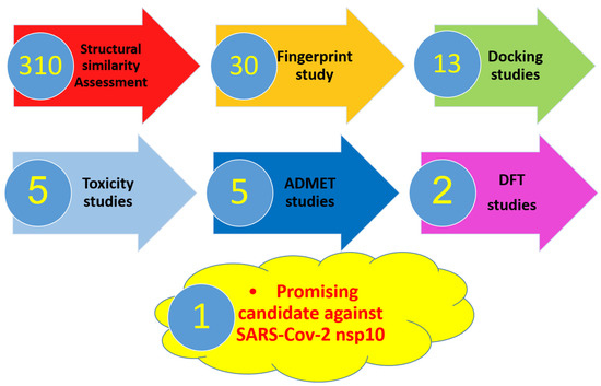 In this study, different computational (in silico) selection methods were applied to 310 candidates. The examined candidates were chosen through a deep database search according to three parameters. The first parameter was to be naturally isolated. The second was having exhibited antiviral potentiality before. Lastly, we considered that the culled compounds belong to different chemical classes and accordingly have various chemical structures. The applied computational techniques were a structural similarity study against SAM followed by a fingerprint study against the same target. The selected candidates were docked against nsp10 (PDB ID: 6W4H) to prefer 44, 48, 85, 102, 105, 182, 220, 221, 282, 284, 285, 301, and 302. Then ADMET and toxicity studies further picked two candidates. Finally, a DFT study suggested the most relevant inhibitor of SARS-Cov-2 nsp10 (Figure 1).