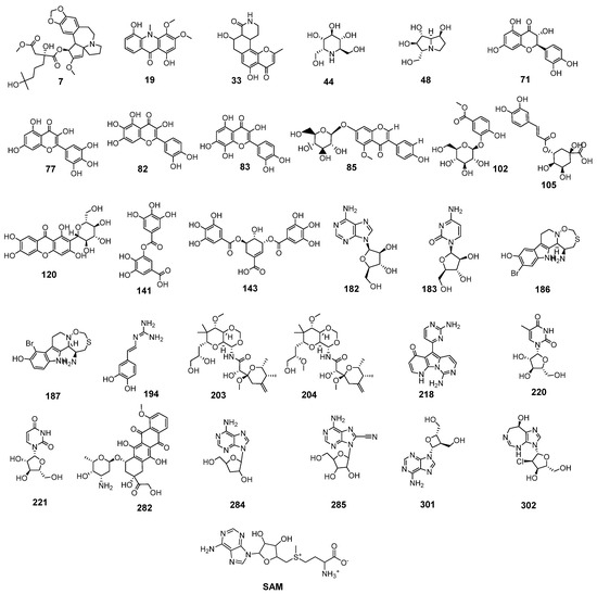 As shown in Figure 2, the similar candidates showed a high degree of structural similarity with SAM. In detail, most candidates have a sugar-like moiety as that of SAM as candidates 85, 102, 105, 120, 182, 183, 203, 204, 220, 221, 282, 284, 285, 301, and 302. These moieties may serve as a good center for hydrogen bonding interaction with the target receptor. Furthermore, most candidates have hetero bicyclic structures as present in SAM. Besides, xanthine-like structures were defined in many similar candidates such as 182, 284, 285, and 301.