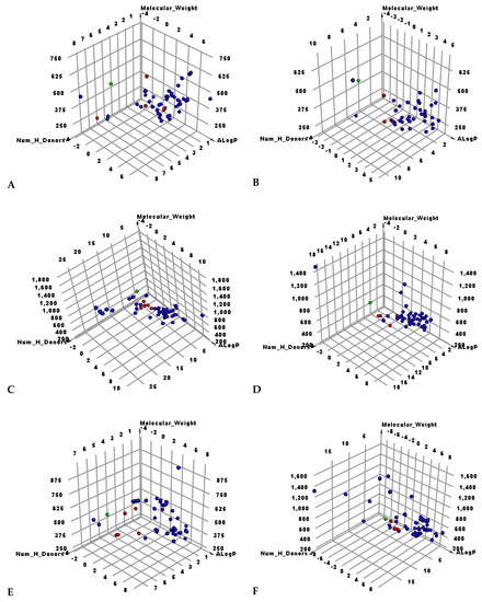 The results of similarity analysis of the test sets and SAM. Green = SAM, red = similar candidate, blue = not similar candidate. (A) Candidates 1–50, (B) 51–100, (C) 101–150, (D) 151–200, (E) 201–250, (F) 251–310.