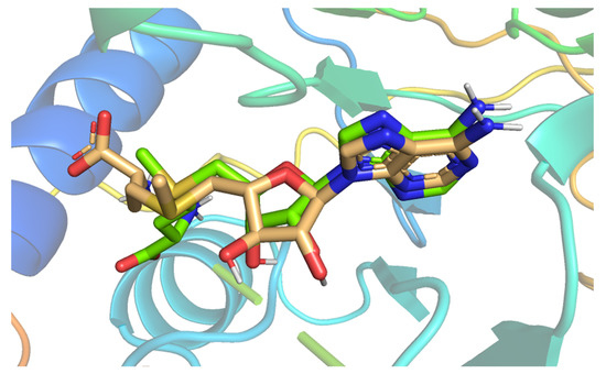 The docking process was validated through a redocking step of SAM against active pockets of SARS-CoV-2 nonstructural protein (nsp10). The suitability of the performed protocol was demonstrated by the small RMSD (0.60 Å) that was found between the docked pose and SAM (Figure 4).