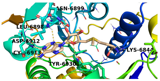 The methylpyrimidine-2,4-dione derivative (220) possessed a good potential affinity of −21.17 into the COVID-19 nsp10 active site. This high affinity is attributed to the formation of five hydrogen bond interactions. The pyrimidine moiety of candidate 220 was involved in two hydrogen-bonding interactions with Asp6912 and Cys6913. While the furan part interacted with the active site by three hydrogen bonds with Leu6898 and Tyr6930 (Figure 6).