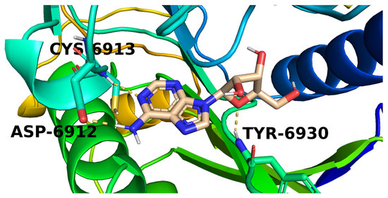 Investigation of the top docking poses of the 6-aminopurine member (182) showed that it interacted with the COVID-19 nsp10 active site through the formation of three hydrogen bond interactions. Its amino group was involved in a hydrogen bond with Asp6912 while one purine nitrogen atom formed a hydrogen bond with Cys6913. In addition, the furan oxygen interacted by a hydrogen bond with Tyr6930 (Figure 8).