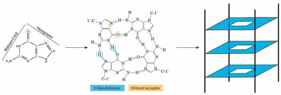 Illustration of G-tetrad formation through Hoogsteen bonds and G-tetrads stacking.