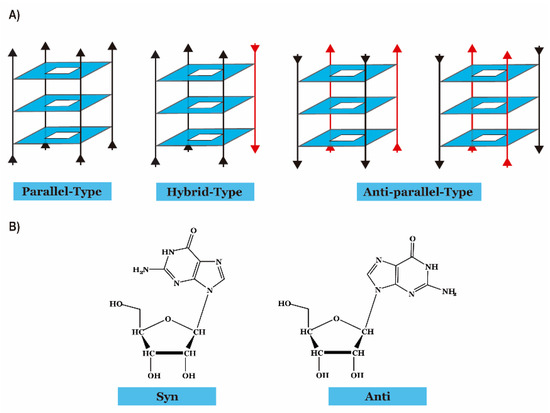 Parallel G4 topology prevails in rG4s, wherein all strands participating in the G4 network follow the same direction (Figure 2A). Upon half the strands presenting a reverse orientation, G4 is defined as antiparallel. Once only one strand is in a contrary direction, the structure is classified as a hybrid G4 (Figure 2A) [16,17]. The 2’ hydroxyl group in rG4s generates extra interactions in comparison with DNA G4s, leading to a more stable, compact, and less hydrated profile in rG4s [18] (Figure 2B).