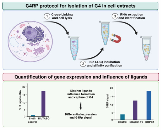 Illustration of G4RP method protocol for isolation of G4 targets from human cell extracts and the influence of the ligands in gene expression. Adapted from ref. [25]. Copyright (2018), with permission from Springer Nature.