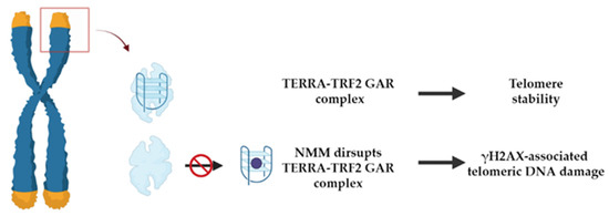 Another telomere-associated lncRNA is the telomeric repeat-containing RNA (TERRA), which was also reported to form rG4s and be involved in the regulation of telomerase activity and DNA telomere length [35]. TERRA RNA is localized to chromosome ends in the nucleus, suggesting a link between TERRA rG4s and telomere function [36]. Several biological functions have been associated with TERRA tandem repeats, namely, modulation of heterochromatin regulation, telomerase inhibition, telomere length regulation, and telomere protection. For instance, TERRA rG4s can interact with telomeric DNA G4s to form intermolecular hybrid G4 structures and suppress telomerase activity [35]. A study of Balasubramanian and co-workers showed that TERRA recruits TRF2, an important protein that regulates the association of TERRA and telomeric DNA [37]. Recently, a study developed by Lieberman and co-workers reported that the G4 structure of TERRA is a recognition element for the TRF2 GAR domain [37,38]. They reported that the interaction between TERRA and TRF2 GAR domain is of utmost importance to maintain telomere stability and regulation. In their study, they used the well-known G4 ligand N-methyl mesoporphyrin IX (NMM: represented in Scheme 1) to disrupt the TERRA-TRF2 GAR complex [39]. Only NMM showed preferential binding to TERRA. The results showed the loss of TERRA, and the induction of γH2AX-associated telomeric DNA damage associated with decreased telomere length, and increased telomere aberrations (Figure 4) [39].