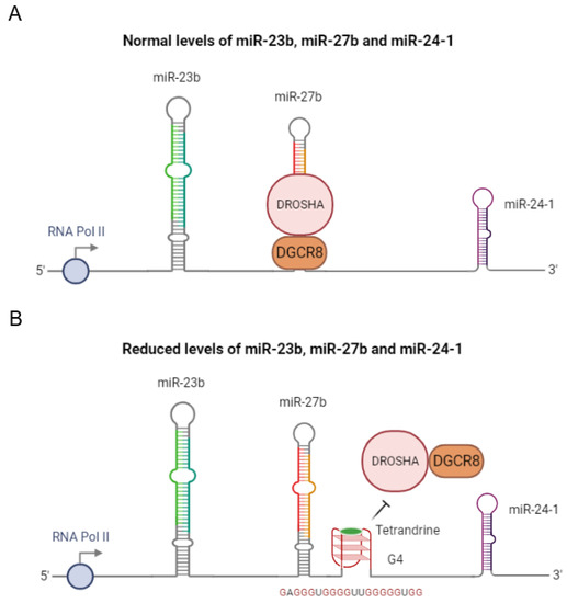 Representation of the influence of G-rich sequence in normal (A) and reduced (B) levels of miR-23b, miR 27b and miR-24-1. Adapted from ref. [42]. Copyright (2021), with permission from Oxford University Press.