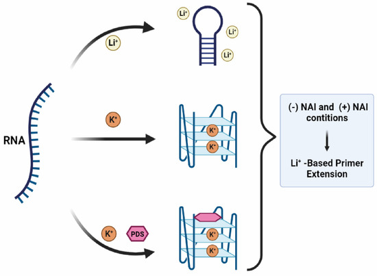 Balasubramanian and co-workers used a new approach to map the G4 formation in RNAs. This new method, called SHALiPE, couples selective 2′-hydroxyl acylation with a lithium ion-based primer extension, and recognizes the structural characteristics for rG4 mapping. They used SHALiPE to prove the formation of an rG4 structure in pre-miR-149. Additional biophysics studies support the SHALiPE and have proven that rG4 has a parallel topology with high thermal stabilization under physiological K+ conditions (Figure 7). The authors still used the G4 ligand and pyridostatin (PDS) (Scheme 1), and the results provided strong evidence that pre-miR-149 can form G4 structure in the presence of K+ and PDS. The presence and stabilization of the G4 structure inhibits the Dicer processing activity in vitro and decreases the miR-149 production [57].