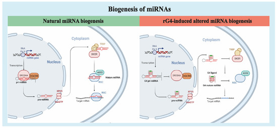 Biogenesis of miRNAs. Comparison of natural biogenesis versus interference of the rG4s in the biogenesis and function of miRNAs.