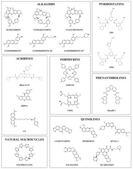Chemical structures of the G4 ligands presented in this review. Small molecules are divided according to the chemical families. Structures were designed with ChemDraw 20.0 ®—PerkinElmer.