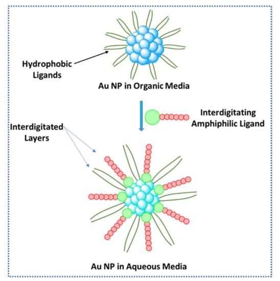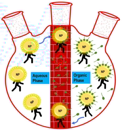 Figure 7. Schematic representation of phase transfer via surface-bound interdigitated layers [7]. Scheme derived from [7]. In the figure, the abbreviation “NP” means nanoparticle.