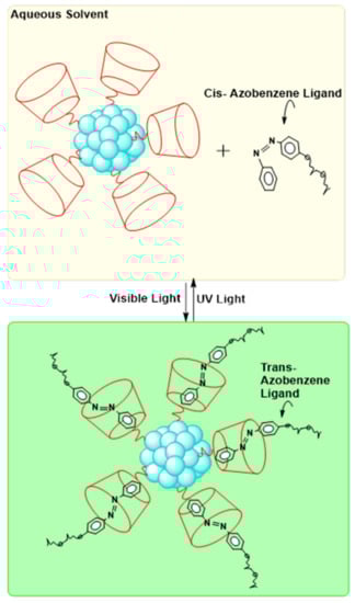 In one report, a photoreversible phase transfer system consisted of an azo-ligand and a thiolated α-cyclodextrine(α-CD) (see Figure 6 below) [35]. Azobenzenes are a class of compounds which undergo photoresponsive cis-trans isomerization using UV and visible light. In this case, the trans azobenzene isomer can form a complex with α-CD through steric and hydrophobic interactions [35]. The cis isomer changes conformation and cannot form the complex [35]. The α-CD AuNPs are first dispersed in water with the trans azo-ligand dispersed in toluene. Through agitation of the biphasic system, the trans azo-ligands are brought into the vicinity of the nanoparticles to form a stable complex, which pulls them into the toluene layer [35]. To reverse the process, one can use UV light [35]. UV light causes the azo-ligand to isomerize from trans to cis, which can no longer form a complex with the α-CD AuNPs. The NPs revert to their hydrophilic nature and return to the water. Exposure to visible light converts the azo-ligand back to its trans form, allowing for the process to be repeated. This method has been applied to quench a nanoparticle catalyzed reaction and to recover and recycle the particles [35]. Host–guest phase transfer, similarly to pH-triggered phase transfer, is highly desired as it provides a method for the fully reversible phase transfer of particles without changing the capping agent.