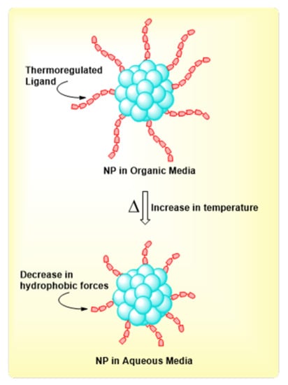 Thermoregulated ligands and molecules experience temperature-dependent solubility in water, which allows for separation upon heating. This property can be utilized to support the transfer of particles between solvents through stabilization of a thermoregulated ligand. In these cases, the properties of the ligand are such that the temperature changes allow for the manipulation of the hydrophobic and hydrophilic forces in organic and aqueous media. A cartoon representation of this concept is shown below in Figure 9.