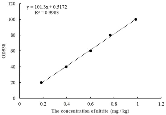 The nitrite concentration in FM samples was calculated by using the Griess reaction [16]. Briefly, an FM sample that weighs 4 g was crushed, deproteinated and defatted by 10 mL of 30% w/v ZnSO4·7H2O solution and 0.5 mL of 15% (w/v) K4Fe (CN)6·3H2O solution. Then, 1 mL of 0.2% sulfanilamide and 1 mL of 0.1% N-1-naphtyethylene diamine dihydrochloride were added sequentially to filtrates. This reaction required the room temperature and a duration of 15 min. The optical density (OD) of the colored mixtures was measured at 538nm against the reagent blank. The standard curve was obtained by performing the same color development process and OD analysis, which is shown in Figure 1.