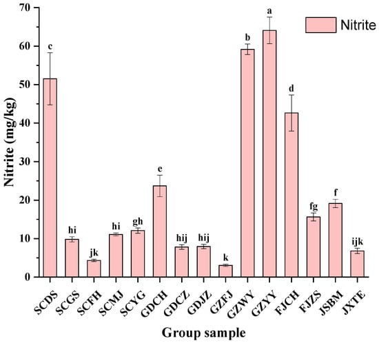 Contents of nitrite in FM samples. Different letters (a, b, c, etc.) indicate significantly different means at p < 0.05.