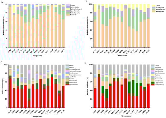 Microbial community in FM samples. (A)Bacteria at the phylum level, (B) Fungi at the phylum level, (C) Bacteria at the genus level, (D) Fungi at the genus level.