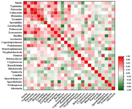 Heatmap of correlations among biogenic amines (BAs), nitrate microbial community and in FM samples. The red and green colors represent positive (0 < r < 1) and negative (−1 < r < 0) correlation, respectively. *, p < 0.05; **, p < 0.01.