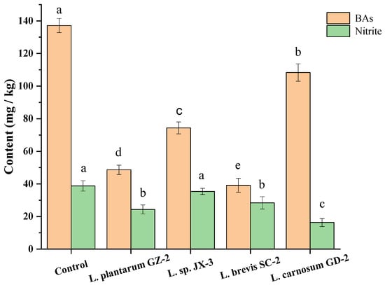 BAs and nitrite contents in model fermented mustard product inoculated with different strains. Different letters (a, b, c, etc.) indicate significantly different means at p < 0.05.