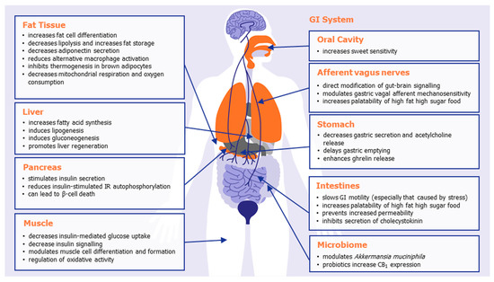 | GI system | Oral cavity | CB1 receptors are expressed in type II taste cells that also express the sweet-taste receptor, and their activation increases sweet sensitivity [35]. CB1 receptors on the tongue increase gustatory nerve responses [35]. |