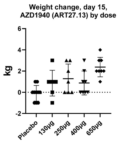 The mean increase in body weight (kg) after 15 days daily treatment with AZD1940 (ART27.13) in healthy volunteers in a dose-ascending study (ClinicalTrials.gov Identifier: NCT00689780, data on file). Data are a presented as a scatterplot with mean and SD.