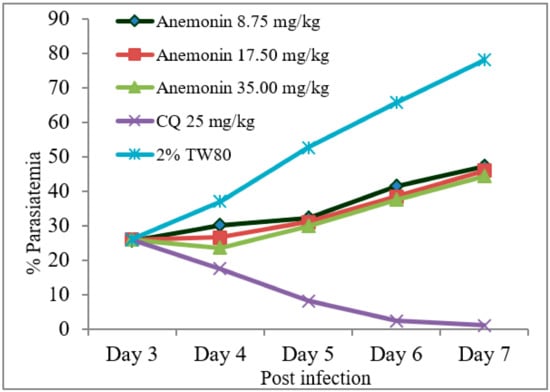Parasitemia development over the course of treatment with anemonin on Plasmodium berghei-infected mice in Rane’s antimalarial test (CQ; chloroquine, 2% TW80: 2% Tween 80).