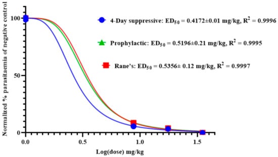 ED50 of anemonin in mice infected with Plasmodium berghei in 4-day suppressive, Rane’s, and prophylactic antimalarial tests; ED50 was estimated from a plot of log dose against the percentage of parasitemia of negative control group (normalized); values are presented as mean ± SEM; n = 5.