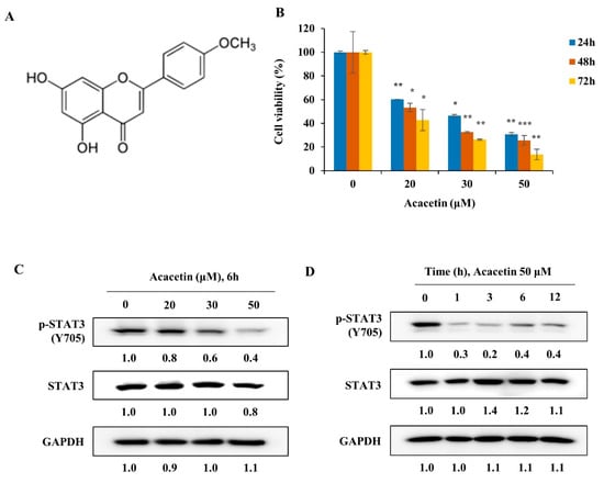 Natural products (NPs) are isolated from live organisms, such as food and plants. NPs represent an unlimited source of drug discovery and more than 49% of antitumor drugs are derived, either directly or indirectly, from NPs [7,8,9]. Thus, there is increasing interest in the discovery of STAT3 inhibitors from NPs, and various types of NPs with STAT3 inhibitory activities have been reported [10]. Flavonoids are polyphenolic compounds and are widespread in a variety of fruits, vegetables, and seeds. They can be classified into flavanones, flavones, flavonols, and biflavones. Many flavonoids exhibit potent antitumor activity against several human cancer cell lines [11]. The flavone acacetin (5,7-dihydroxy-4′-methoxy flavone) has been reported to alleviate arthritis, obesity, asthma, neuroinflammation, and many types of cancer, including colorectal, breast, prostate, skin, and lung cancer, and leukemia [12,13]. Acacetin exerts an anticancer effect by regulating the activity of a wide variety of targets; its representative targets are PI-3K, VEGF, JNK, and STAT3 [14,15,16]. Although the target molecules of acacetin have been identified, the different modes of action associated with the binding target of acacetin are not yet completely understood.