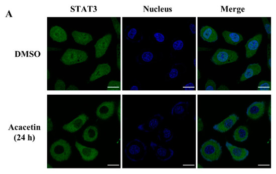 DU145 cells (1.0 × 105 cells) were plated into 35 mm high μ dishes (ibidi GmbH, Am Klopferspitz, Germany). The cells were washed once with PBS and treated with DMSO or acacetin (50 μM) for 24 h. After washing with PBS twice, the attached cells were fixed with 4% paraformaldehyde in PBS for 10 min at room temperature. The fixed cells were permeabilized with 0.2% Triton X-100 for 10 min and blocked with 1.0% BSA in PBS for 1 h. The cells were incubated with an anti-STAT3 antibody followed by goat-anti-rabbit IgG-FITC secondary antibody. The nuclei were counterstained with 2 μg/mL of DAPI in PBS for 2 min. All images were acquired on a laser scanning confocal microscope (LSM 510 META; Carl Zeiss, St. Cloud, MN, USA) and analyzed with the LSM Version 3.2 software (Carl Zeiss).