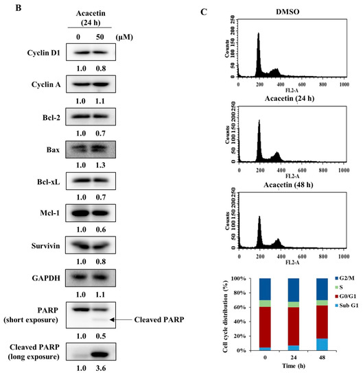 STAT3 is a transcription factor that regulates genes that are involved in proliferation and apoptosis [23]. Downstream target genes of STAT3, such as cyclin D1, Bcl-2, Mcl-1, Bcl-xL, and survivin, are involved in cell apoptosis and proliferation [24]. STAT3 is phosphorylated at the tyrosine-705 residue and forms homodimers, followed by translocation into the nucleus to regulate the expression of target genes [2,3]. We found that acacetin suppressed the nuclear translocation of STAT3 after 24 h of treatment in DU145 cells (Figure 2A). After 24 h of treatment with acacetin, acacetin inhibited the expression of STAT3 target proteins, such as cyclin D1, Bcl-2, Bcl-xL, Mcl-1, and survivin (Figure 2B); however, Bax, an apoptotic marker protein, was increased in acacetin-treated cells. Moreover, we evaluated the effect of acacetin on the cell cycle progression in DU145 cells using a FACSCalibur flow cytometer. As shown in Figure 2C, when acacetin was added to DU145 cells, the proportion of sub-G1 phase cells was increased, resulting in an increase in cleaved PARP. Then, we used an Annexin V-FITC assay to quantitatively evaluate the percentage of apoptotic cells and found that treatment with acacetin for 24 or 48 h increased the percentage of apoptotic cells by 2.4% and 4%, respectively (Figure 2D). Our results suggest that acacetin induces cell apoptosis by downregulating STAT3 target genes, which are involved in pro- and antiapoptotic proteins. Recent studies have indicated that NPs can be used as anticancer therapies with relatively low toxicity [9]. Although there are many problems in the clinical application of NPs, such as their low aqueous solubility, low metabolic stability, and low bioavailability, these problems are expected to be improved quickly with the development of nanotechnology and drug delivery tools [25]. Therefore, our results suggest that acacetin could be a potent anticancer agent targeting STAT3-activated cancer cells.