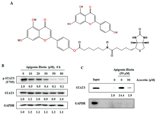 There have been reports that some STAT3 inhibitors bind directly to STAT3 and inhibit STAT3 phosphorylation within 1 h [20,29,34]. Acacetin also inhibited STAT3 phosphorylation within 1 h (Figure 1D). To assess the direct binding of acacetin to STAT3, we synthesized biotinyl–apigenin, in which only methyl groups were removed from acacetin (Figure 5A). To test whether biotin-apigenin decreases STAT3 phosphorylation in a manner similar to acacetin, DU145 cells were treated for 6 h. Biotin-apigenin was found to decrease the level of p-STAT3-Y706 by 90% at 50 μM (Figure 5B), indicating that it maintained its biological activity and could be used for pull-down assays. Lysates of DU145 cells were incubated with acacetin for 1 h and then incubated with biotin-apigenin at room temperature for 1 h. The bound proteins were precipitated with NeutrAvidin-agarose resin, resolved via SDS-PAGE and immunoblotted with antibodies against STAT3 or GAPDH (Figure 5C). Biotin-apigenin binds to STAT3, and its binding was reduced competitively by acacetin.