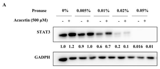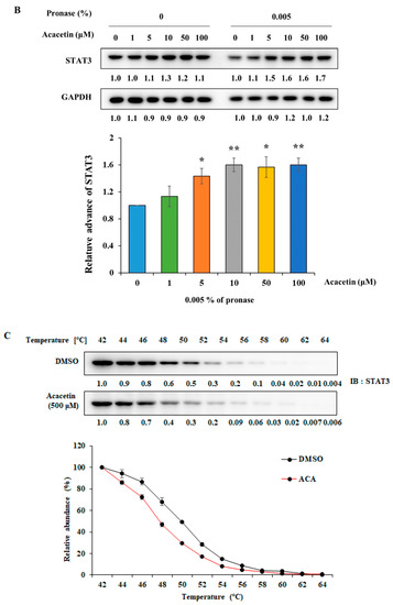 Additionally, we confirmed the binding of acacetin to STAT3 using label-free methods, such as DARTS and CETSA. DARTS is based on the principle that a small-molecule drug will stabilize the structure of a target protein and cause protease resistance [35]. Acacetin weakly enhanced the protease resistance to pronase (Figure 6A) and STAT3 accumulation was increased in a dose-dependent manner with 0.005% pronase (Figure 6B). CETSA is based on the idea that the stability of proteins is affected by the binding of small molecules to proteins, and protein thermal stability assays have been used for many years in drug discovery programs, including for STAT3 inhibitors [36]. After the treatment of DU145 cell lysates with acacetin, the thermal stability of STAT3 decreased, with an increased melting temperature (Figure 6C). At 50 °C, acacetin decreased the thermal stability of STAT3 in a dose-dependent manner; however, acacetin did not change the STAT3 level at 37 °C (Figure 6D). Collectively, acacetin specifically binds to STAT3 in DU145 cells, showing the increased pronase resistance and decreased thermal stability of STAT3. These data indicate that acacetin binds directly to STAT3 and then selectively and specifically inhibits the proliferation of human cells that exhibit constitutively active STAT3.