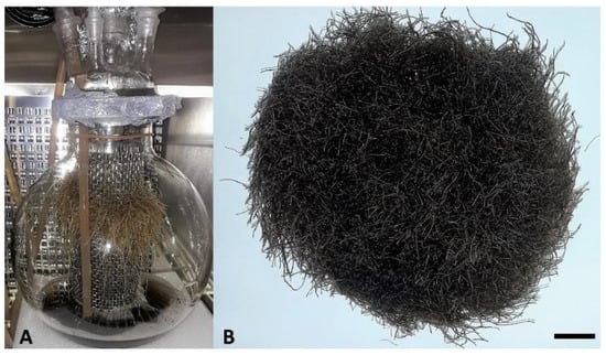 (A) Transgenic hairy roots cultivated in 10 L sprinkle bioreactor after 25 days of culture (before elicitor application). (B) Hairy roots after 35 days of culture in bioreactor and 10 days elicitor treatment; bar = 1 cm.