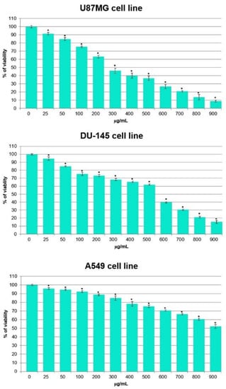 The result of the MTT revealed that the tested transgenic hairy root extract decreased the percentage of viability for all of the cells, but to a different extent and depending on the tested cell line (Figure 3). The extract was found to induce more cytotoxicity towards cancer cell lines U87MG, DU-145 and A549 with IC50 = 250 µg/mL, 550 µg/mL and 920 µg/mL, respectively. The U87MG line was the most sensitive to the effect of the tested extract; therefore, this line was chosen for further studies. In turn, for the hairy root extract in the tested concentration range, IC50 was not reached for the A549 cancer cell line.