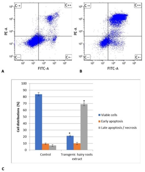 Apoptosis/necrosis induction by transgenic S. obtusifolia hairy root extract at the IC50 concentration on U87MG cell line for 24 h determined by Annexin V–FITC/PI flow cytometry. Graphs represent distribution of the cells in viable state, early and late apoptosis and necrosis in (A) control, untreated U87MG cells and (B) 24 h after treatment with MeJA extract. (C) Diagram shows percentage of cell populations divided into viable cells, early apoptotic, late apoptotic/necrotic cells. Data represent the mean ± SD (n = 3). * p < 0.05 transgenic hairy root extract vs. control.