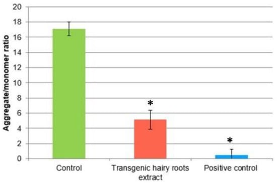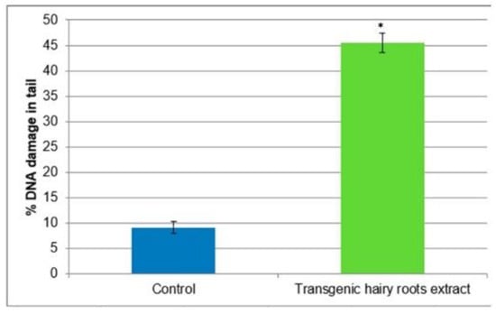 Analysis of DNA damage as measured by comet assay in U87MG cells treated with transgenic hairy root extracts of S. obtusifolia after 24 h. Each value represents mean ± SD of three separate experiments. * p < 0.05 transgenic hairy root extract vs. control.