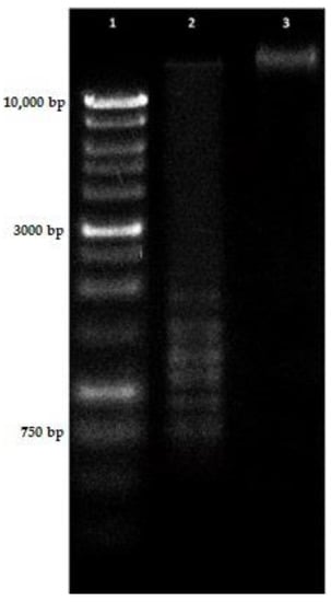Electrophoresis of DNA extracted from U87MG cells, after treatment with transgenic hairy root extract after MeJA at IC50 concentration after 24 h treatment. Lane 1, DNA molecular weight marker; Lane 2, DNA isolated from cells treated with transgenic hairy root extract for 24 h; Lane 3, DNA isolated from cells treated with 0.1% DMSO for 24 h.