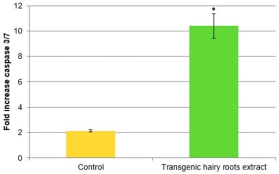 Caspase-3/7 enzymatic activity of U87MG cells and fold increase in activity after 24 h treatment of with IC50 of the transgenic hairy root extract of S. obtusifolia after MeJA. All data expressed as mean ± standard deviation (SD) at a significance level of * p < 0.05.
