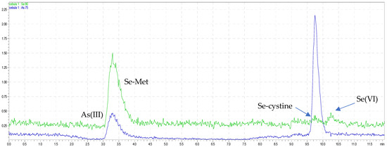 The As and Se species were completely resolved on use in the Dionex IonPac AS22 analytical column connected to the Dionex IonPac CG5A guard column with gradient elution. We applied the gradient elution to improve the separation of As and Se species. A similar way to achieve full separation of arsenicals was presented in a study by Kohlmeyer et al. (2002) [29], where the method with anion exchange with nitric acid eluents together with a doubly charged ion-pairing agent was applied to separate anions and cations of arsenicals together in a single chromatographic run. Additionally, the Sloth et al. (2003) [30] used the gradient elution for separation the organoarsenicals in one chromatographic run using cation exchange. The goal of present study was to make the simultaneous speciation of arsenic and selenium in one run; that is why we used anion exchange column in combination with an anion–cation exchange guard column, which was not yet applied in speciation analysis of metalloids. The most commonly column for speciation of arsenic is anion exchange chromatography with Hamilton PRP-X100 column [31], which we tested but did not obtain full separation of arsenic and selenium forms (Table 1). Furthermore, Sakai et al. (2001) [32] also used anion and cation exchange columns to separate eight arsenicals. In this study, we applied the combination of anion and cation exchange columns for speciation analysis of arsenicals in seafood. It is well known that chromatographic approaches, such as ion-pairing reversed-phase, ion-exchange, ion exclusion, and reversed-phase chromatographies, are reported to facilitate speciation of arsenicals in marine sample extracts. Moreover, it was confirmed that methylated arsenicals and AsSugars were successfully isolated on anion exchange columns, while cation exchange columns were efficient for separation for AsB, AsC, DMA, TMAO, TETRA, and DMAA, while for AsLipids, RP–LC was typically used with a C8 or C18 column [33]. In addition, in the literature was found that arsenobetaine (AsB) at pKa = 2.18 is zwitterionic; that is why, in our case, the use of a bifunctional column was justified [33]. The chromatographic separation obtained for the analytes in standard solutions at the mentioned concentrations are presented in Figure 1 and Figure 2. It is worth noticing that, in the case in speciation analysis of arsenic, the use of separate chromatographic methods is recommended for different groups of arsenicals because it is difficult to achieve efficient separation of anionic and cationic species using a single method. For example, in the study by Wolle et al. (2021) [34] the As(III), As(V), DMA, and MMA were separated by the anion exchange method, and AsB was separated on a cation exchange column in aqueous extracts analyzed by HPLC−ICP–MS, but each column was used separately. Morevoer, the AsB form was separated in 20 min (cation exchange) and As(V) form in 30 min (anion exchange) by HPLC–ICP–MS. Similar to our study, Sakai et al. (2001) used anion and cation exchange columns to separate eight arsenicals [32]. They obtained good resolution, but the serious limitation to apply this method was long chromatographic run time of 40 min. Furthermore, in the case of applied ion exclusion chromatography with ICP–MS detection by Nakazato et al. (2000) for separation of arsenic species, the long chromatographic run times (up to 60 min) was the main disadvantage of this method [35]. In this study, we obtained in one run of not only arsenic species but also selenium species in short chromatographic run time (10 min) with a sufficient resolution, which is to opposite to previous studies, where species of these metals were analyzed separately [36,37,38,39]. Moreover, the additional advantage of this research was the successful separation of the rarely presented organic form of selenium, Se-cystine. Other studies have focused only on total Se content [40].