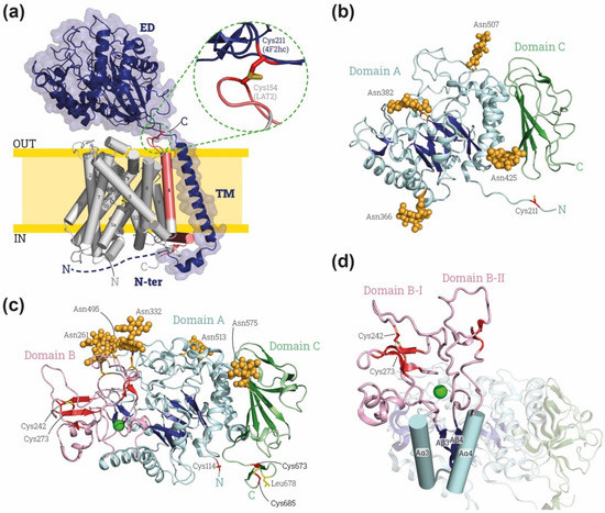 Overview of HAT structures. (a) Representative HAT structure. Cryo-EM structure of human 4F2hc-LAT2 (PDB: 7CMI [7]) is shown: heavy subunit 4F2hc is indicated in dark blue and by blue cartoon with a transparent surface, and light subunit LAT2 is indicated in gray and red cylinders. The transmembrane (TM) domains of LAT2 are numbered from the N to the C-terminus. On the right, close-up for the disulfide bond between heavy and light subunit. Heavy subunit contains an ectodomain (ED), a transmembrane domain (TM) and an N-terminus domain (N-ter). Domains of LAT-2 interacting with heavy subunit are colored in red. (b) Human 4F2hc-ED structure, PDB: 7DSK [8]. The four glycosylation moieties are shown in light orange spheres, and subdomains A and C in blues and greens, respectively, with brighter colors indicating the β-sheets. The cysteine involved in the disulfide bridge with LATs (Cys 211 in human 4F2hc) is shown in red at the N-ter. (c) Human rBAT-ED structure, PDB: 6LI9 [9]. The five glycosylation moieties are labelled by light orange spheres, and subdomains A, B and C in blue, red and green, respectively, with brighter colors indicating the β-sheets. The cysteine involved in the disulfide bridge with LATs (Cys 114 in human rBAT) is shown in red at the N-terminus of rBAT-ED. L678 is colored in yellow and Ca2+ atom is represented by green ball. (d) Detailed view of the domain B with subdomains BI and BII (loops Aβ3-Aα3 and Aβ4 and Aα4, respectively) stabilized by a Ca2+ (green ball). Images were created with the PyMol Molecular Graphics System, Version 2.1.4., Schrödinger, LLC.